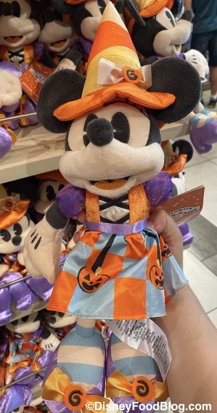Of course, there’s a Minnie Halloween Plush available for $22.99 as well — and she looks precious in her witch costume! Just like Mickey, this exact design isn’t available online right now, but there’s a SUPER CUTE Minnie Halloween Plush whose skirt features Halloween snacks on shopDisney!