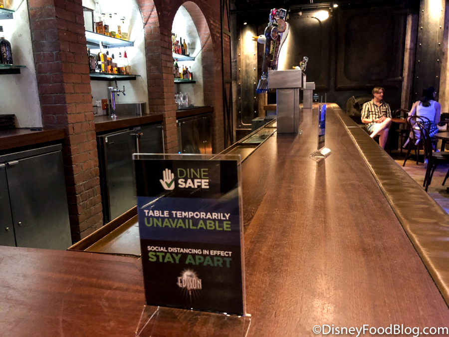 The check-in line had plexiglass barriers in place. These have been implemented all over Disney World to create a protective barrier between guests and employees. We visited The Edison the day after it opened on a Friday night. Even with limited capacity, the restaurant was considerably empty. Usually, the entertainment draws large weekend crowds. We didn’t have to wait long to get checked-in. Again, this may change as things ramp up!