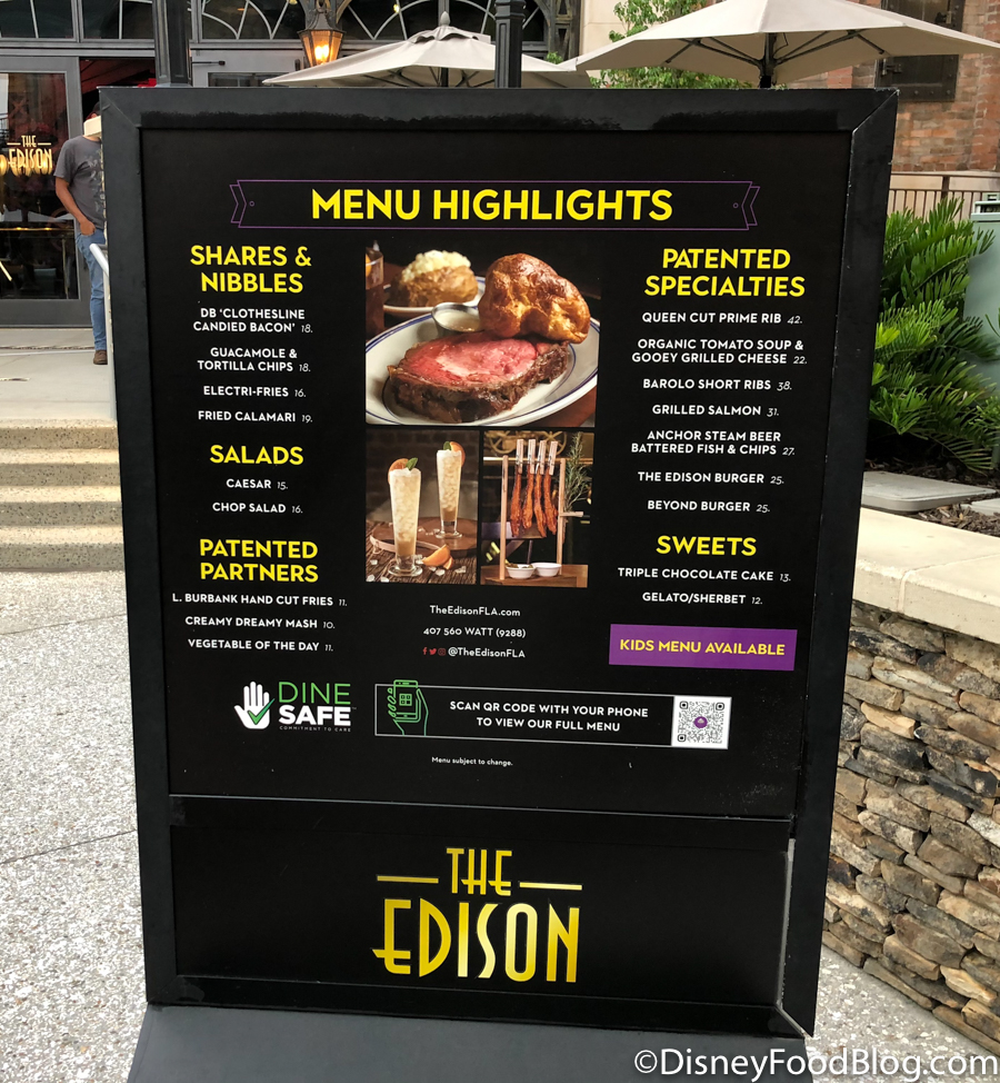 Health and safety restrictions have been implemented at all Disney World restaurants. Menus have been pared back, tables are spaced out to allow for physical distancing, and business capacities are limited to reduce crowding. As such, we had a sneaking suspicion some of the entertainment would be altered and the food would be limited at The Edison. It also should be noted that The Edison is currently only open for dinner. Prior to closing, it was also open for lunch. Let’s see what we found… .