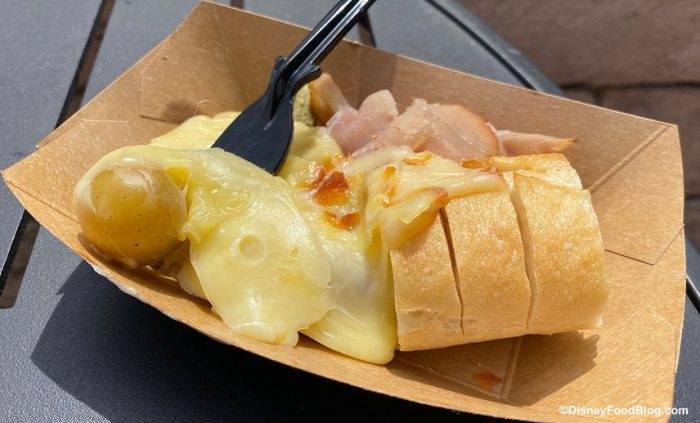 Plus, the pickles and potatoes pack some extra flavor and texture with each bite, along with the baguette for dipping! Although it’s more like a fondue or mini charcuterie, the Warm Raclette Swiss Cheese is definitely big enough to sub out for your lunch or dinner in the parks.
