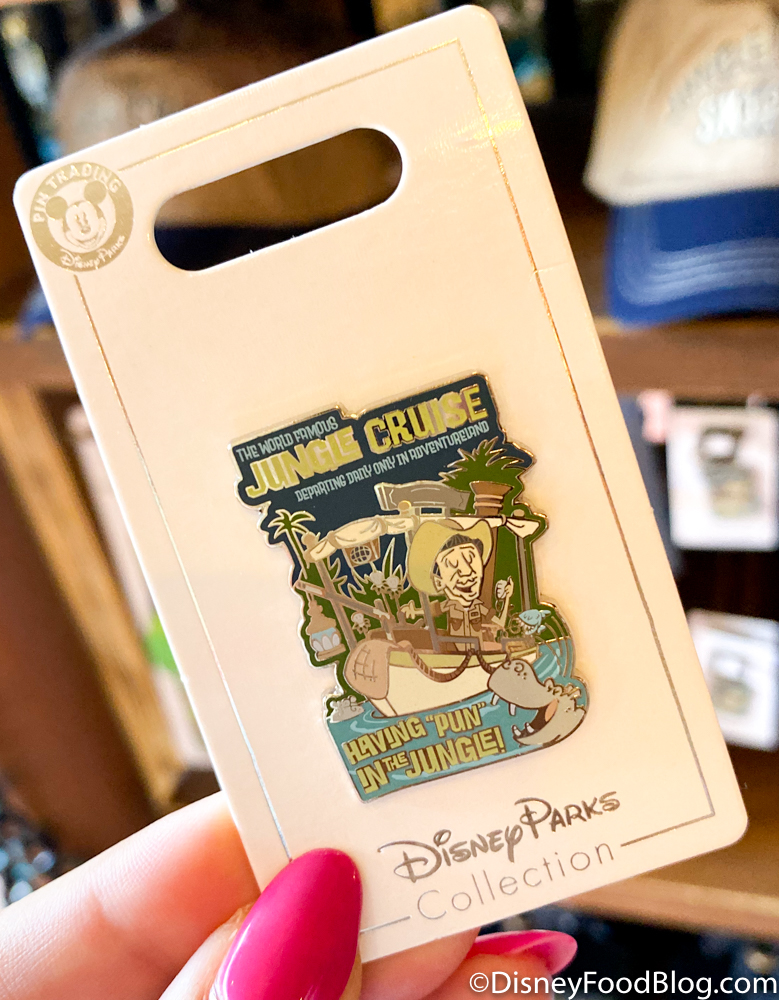 We were searching for gold doubloons at the Pirates gift shop and found a couple treasures new to this part of the park. We spotted the new Jungle Cruise pin for 9.99…