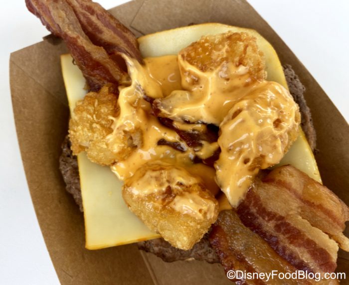 Still hungry? We’ve got something savory for all you cheese and spice fans out there! The Monster Mash Burger is stacked up with a beef patty, Meunster cheese, potato barrels (swoon), bacon, and sriracha aïoli in-between Mickey decorated buns.