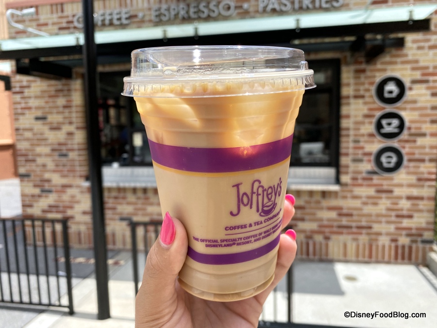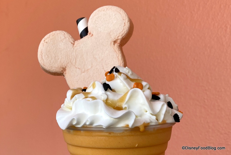 This mega-cute treat comes topped with whipped cream, caramel drizzle, sprinkles, and a Mickey-shaped marshmallow straw (which basically means that a HUGE Mickey marshmallow is placed on the festive black-and-white straw).