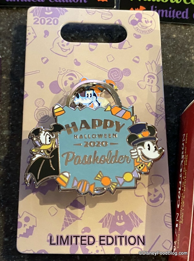 First up, let’s have a look at the Limited Edited Annual Passholder Pin for Halloween 2020 which just so happens to feature Mickey, Goofy, and Donald peeking out from a treat bag. (We’ve also seen Mickey and Donald out and about in their Halloween costumes today!)