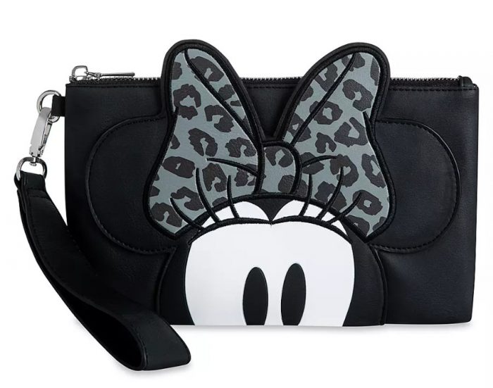 Minnie peeks at us from this small bag, wearing a VERY stylish animal print bow. The wristlet is faux leather with a detachable strap, so you can also use it as a clutch.
