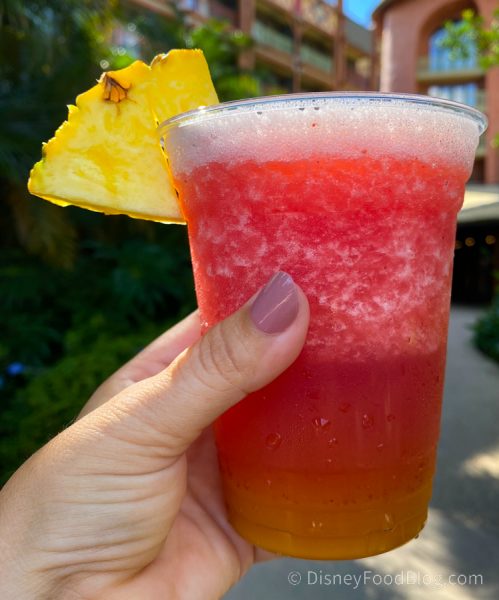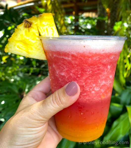 A Cast Member also told us you can request a virgin version of the drink for kids, too! They ring it up as a virgin strawberry daiquiri, so you have to make sure to ask for strawberry and mango to get the same flavors as the African Sunset.