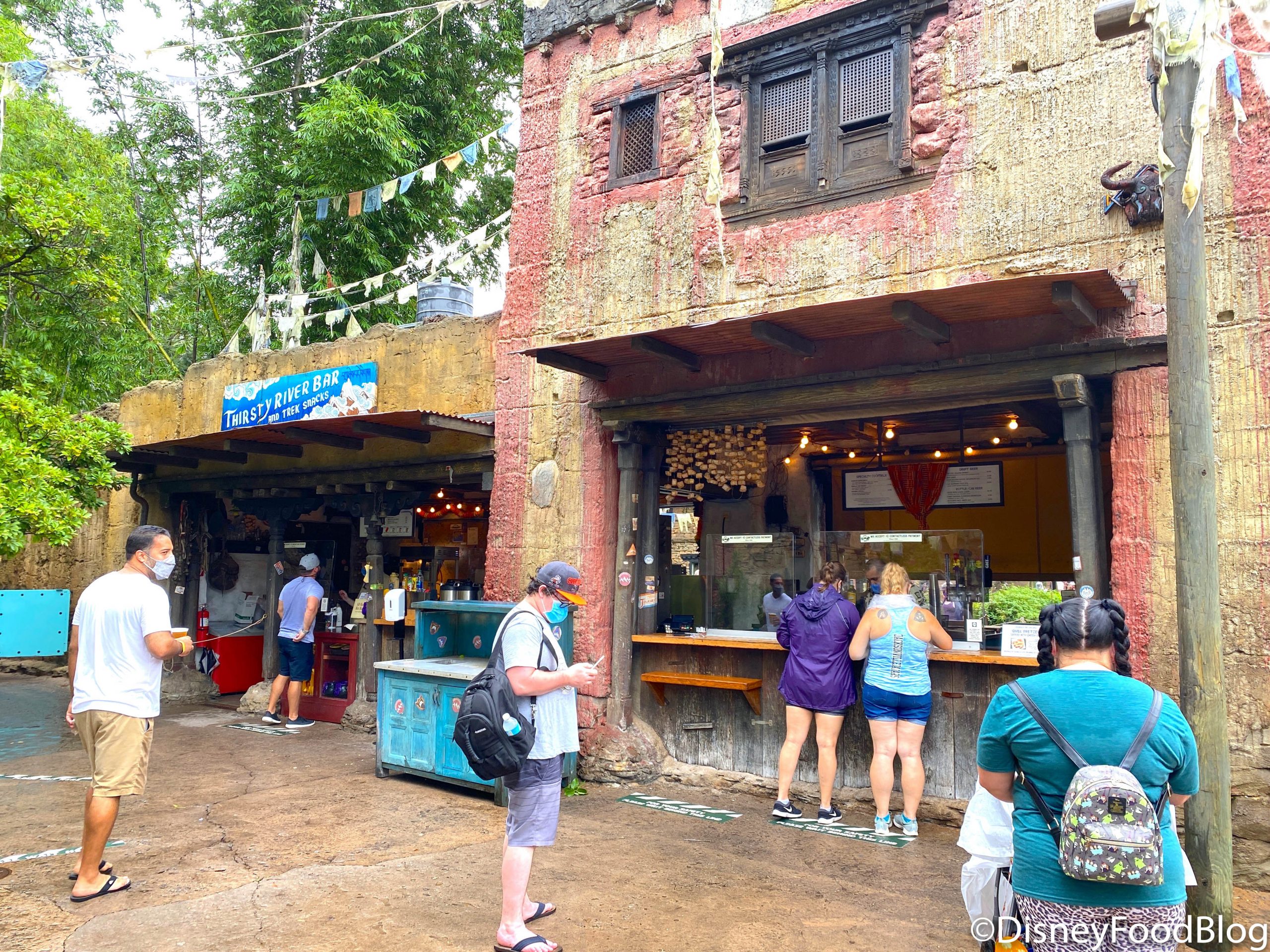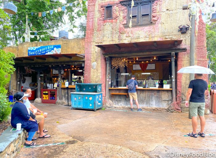 Guests who pop over to the area will be asked to wait behind distancing markers until Cast Members can place their order. And note that Thirsty River is only operating with one side of its bar open at the moment!