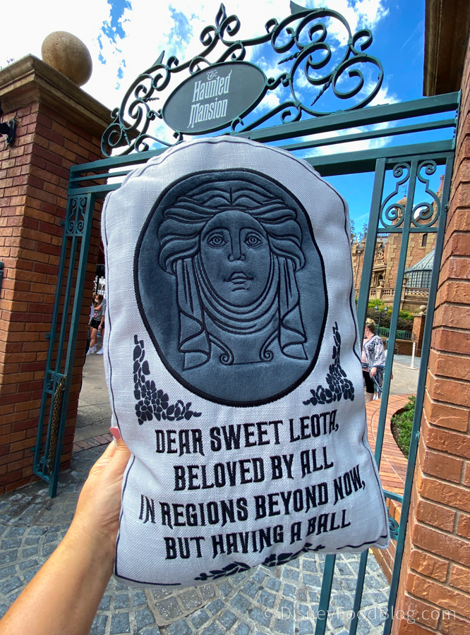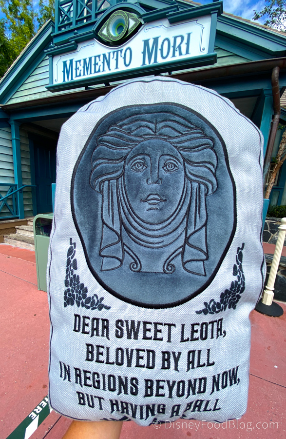 It’s going to be one of those fun items that every Haunted Mansion fan will need to have. It’s also perfect for Halloween! We found this amazing pillow at Memento Mori at Magic Kingdom for $29.99. In fact, we’re going take a nap with it just as soon as we finish pigging out on the Constance’s For Better or For Worse Cake.