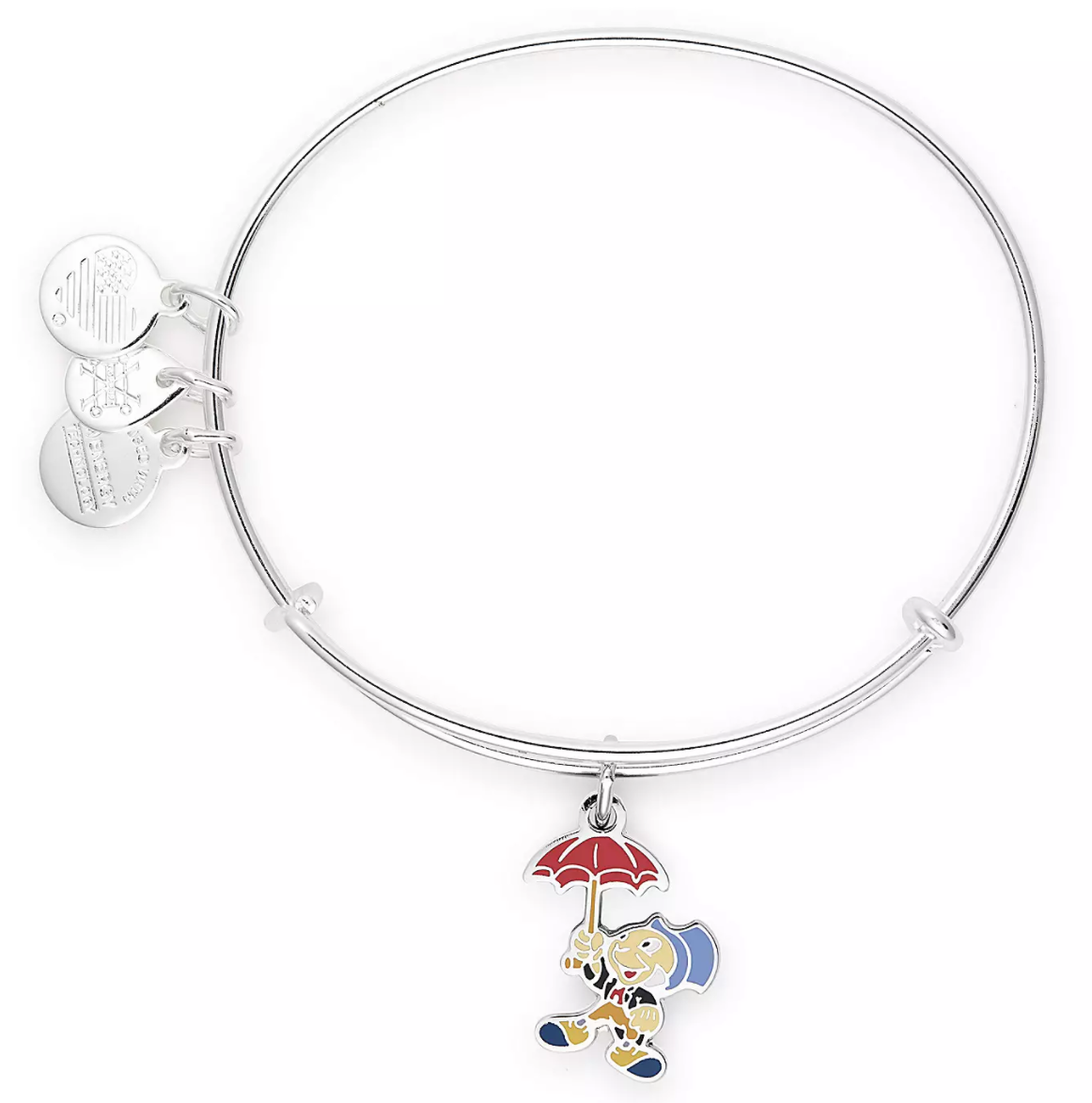 Our favorite little conscience floats down from his tiny umbrella on this enamel charm where he dangles on a shiny silvertone bangle.