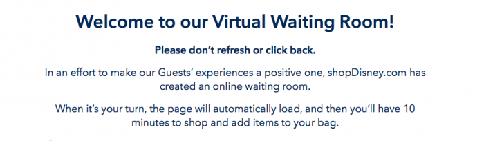 This morning, when we visited shopDisney, we were initially placed in a virtual waiting room. The notice we saw indicated that once the page loaded to the regular shopDisney website, we’d only have 10 MINUTES to shop and add items to our bag.