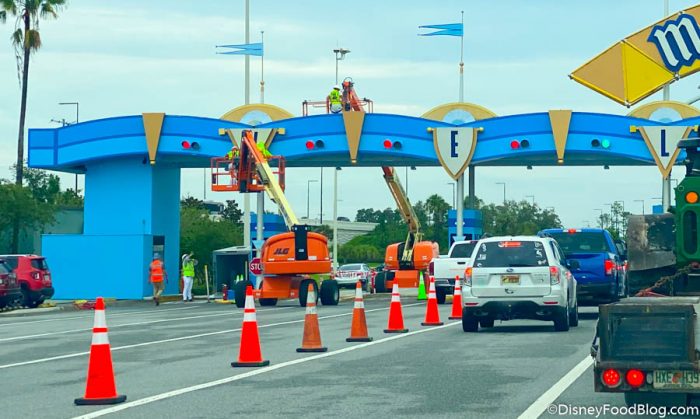 On to construction! On our way into Magic Kingdom we noticed that there was a construction team doing some work on the entrance sign.