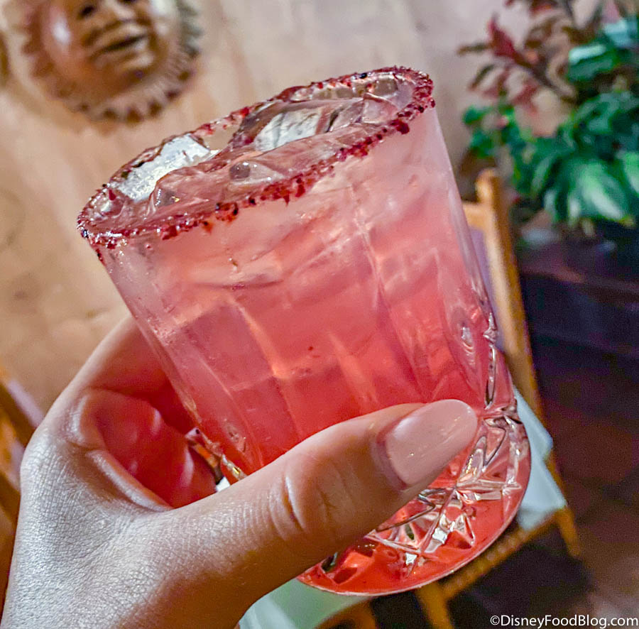 We started with drinks because we’re never ones to turn down a new margarita! We decided to go for the “Welcome Back Drink,” which was the Pink Popcorn Margarita!