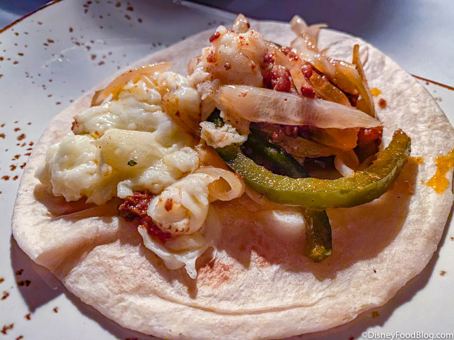 Obviously, it was time for food! Since cheese is basically our love language here at DFB, we went for the Queso Fundido for $14. This wonderfully cheesy concoction is melted Monterey Jack Cheese topped with chorizo, poblano peppers and onions served with flour tortillas. Note that this is actually the same Queso Fundido you can get across the way at La Hacienda de San Angel, Mexico’s other Table Service restaurant!
