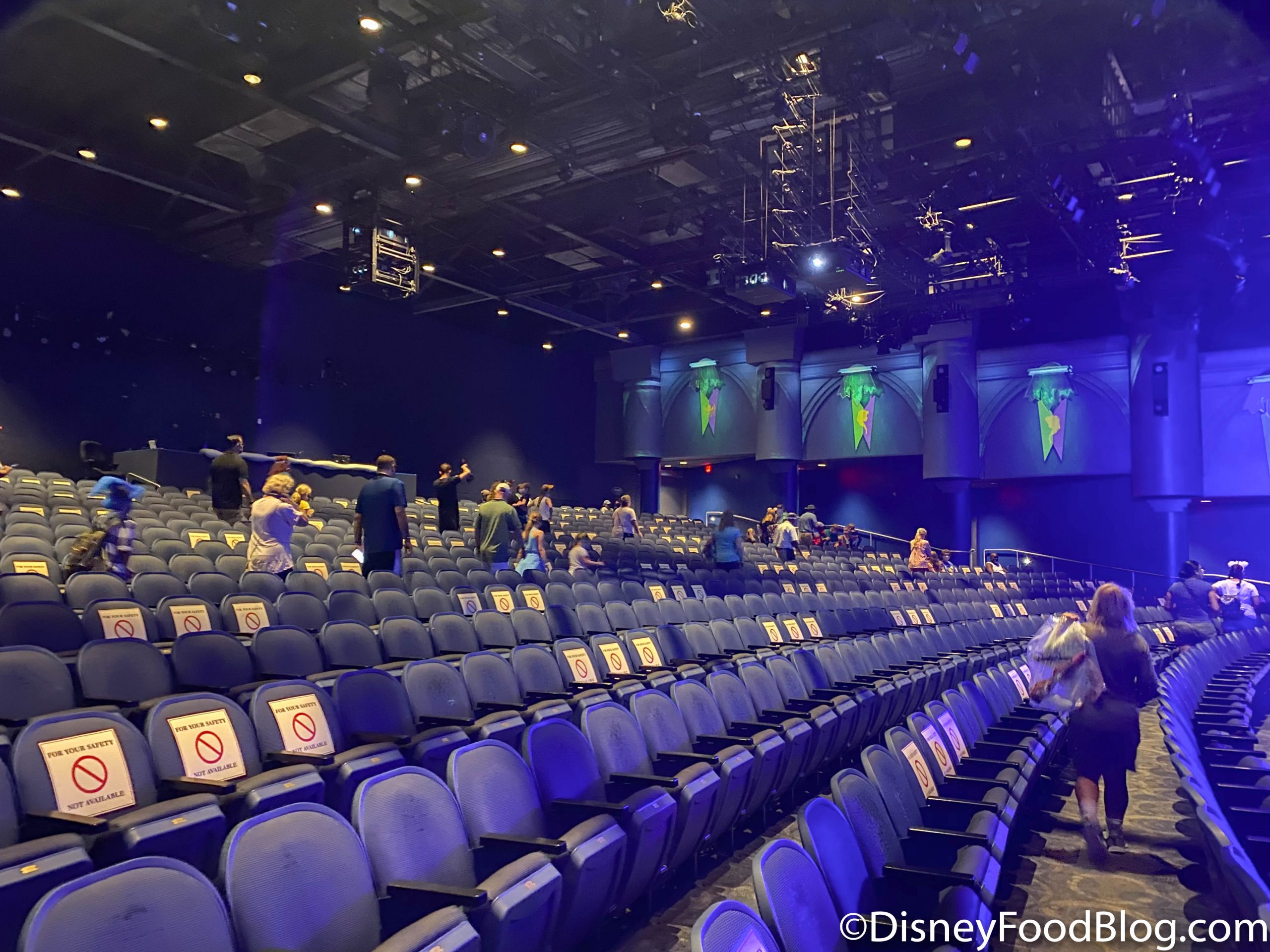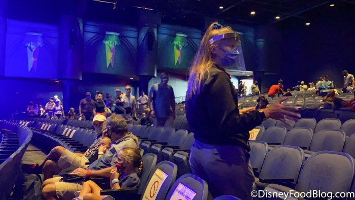 Before we entered the theatre, the Cast Members asked everyone to keep their masks on. They also instructed us to move all the way down to the last chair that is open for seating, and to remain seated until the end of the performance, at which point a Cast Member will come to the row and signal that it is time for our row to stand up and exit the theatre.