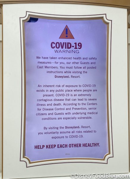 Another screen notes that Disney is utilizing enhanced safety measures for the benefit of guests and Cast Members, and that you must follow all posted instructions while visiting Disneyland Resort. It also specifies that there is an inherent risk of exposure to COVID-19 in any public place where people are present, and explains that by visiting Disneyland Resort you voluntarily assume all risks related to exposure to COVID-19.
