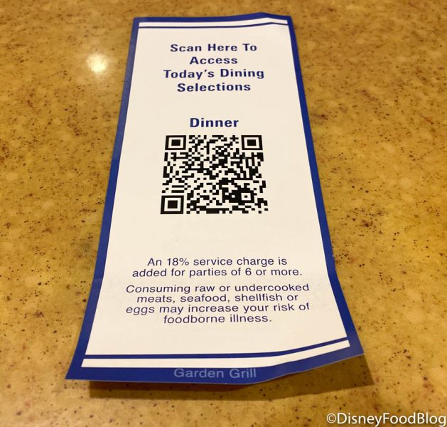 You’ll have access to Mobile Dining Check-in, which allows you to check in to your reservation contact-free. All you have to do is scan the QR code near the entrance of the restaurant to be directed to the My Disney Experience app for a questionnaire about your group’s needs including party size, dietary restrictions, accessibility needs, and if you’re celebrating anything.