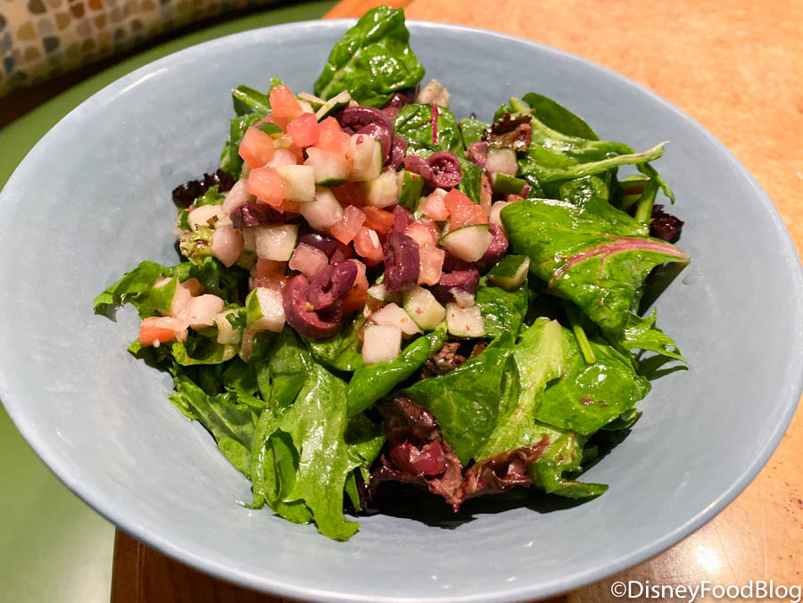 The Harvest Garden Salad might not look like anything fancy, we think it’s worth noting that the ingredients are actually from inside The Land! Disney harvests its own plants and food just right downstairs (which you can see if you take a trip on Living with the Land). Rest assured your salad is FRESH whenever you go to Garden Grill. Note that the salad can change slightly from visit to visit depending on what’s fresh. Ours had chopped cucumbers and tomatoes, and kalamata olives — yum!