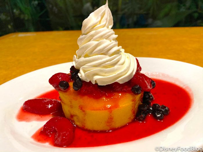 The menu at Garden Grill is pretty easy to wrap your head around — everything is served all-you-care-to-eat family-style. This means big bowls or skillets will be brought to your table with enough food for everyone and if you want more of anything, you just ask! Breakfast (which is currently not being offered due to the park’s later opening time) was comprised of a skillet of breakfast staples along with fruit, sticky buns, and more. Lunch and dinner share the same menu and it has remained mostly unchanged from our past experiences — a hearty skillet of meats, fresh veggies, salad, shortcake, and more.