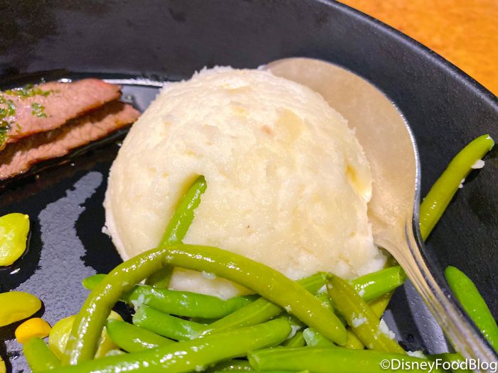 The grilled beef was new to us on the platter so we dove into it first. It was so tender that we were able to cut into it VERY easily as we paired it with the other dishes in our feast. But, we have to say that the garlicky herby chimichurri on top really brought out the flavors of the beef. It was served alongside corn with lima beans and red peppers. The corn was fine. Honestly, with all the other good stuff on the plate it got a bit overshadowed, but if you or your kids prefer a simpler veggie side (not counting those mashed potatoes) this should hit the spot.