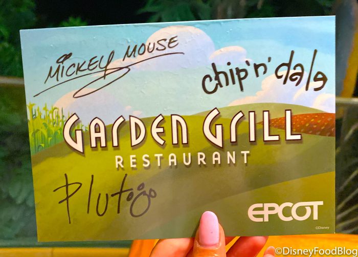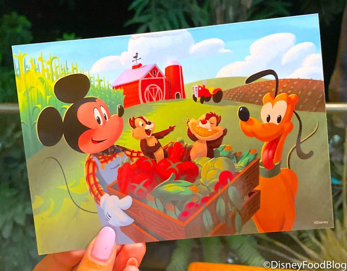 At the end of the meal, guests are given a souvenir postcard featuring the Garden Grill characters having their own Harvest Feast on a farm! (Mickey sure does seem to have a green thumb, don’t you think??)