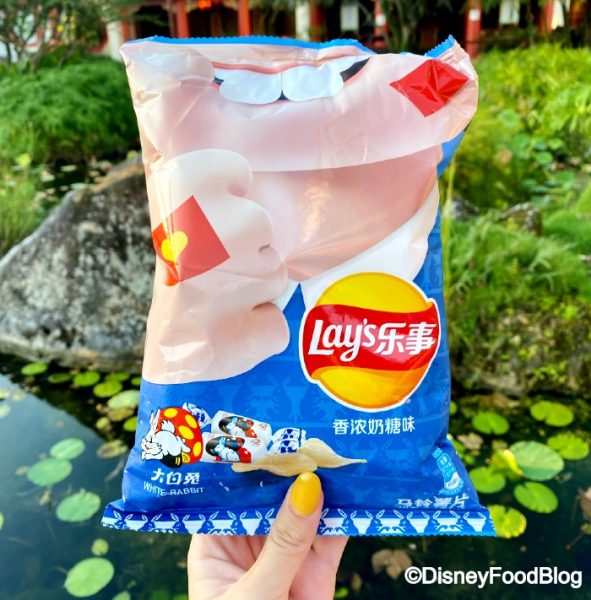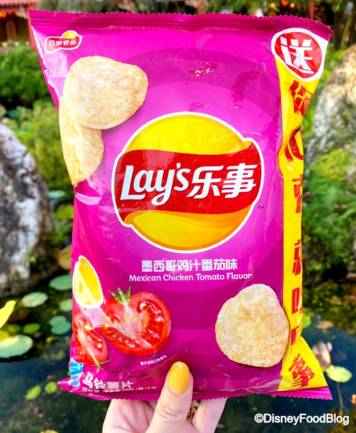While walking around EPCOT, we stumbled upon some uniquely-flavored Lays potato chips at House of Good Fortune! What flavors, you ask?! Mexican Chicken Tomato Flavor and White Rabbit, which is a milk candy from China.