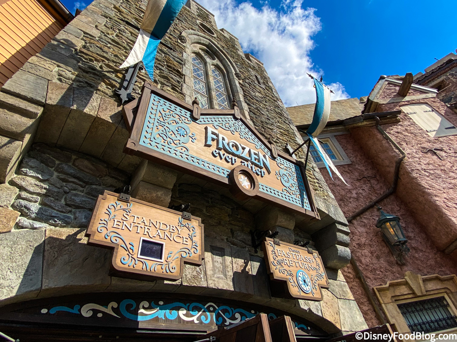 We got in line with a 65 minute wait listed at Frozen Ever After and boarded a boat after 52 minutes (-13 minutes). One reader saw a posted wait of 90 minutes and waited 35 minutes (-55 minutes), and another saw a posted wait of 100 minutes and waited 40 minutes (-60 minutes).