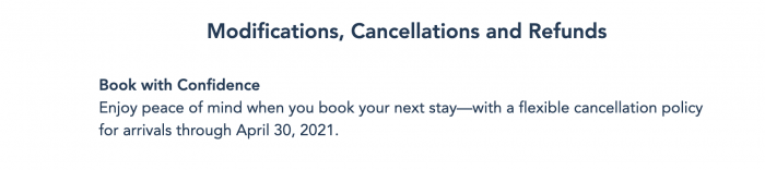 Today, Disney World’s website was updated with language indicating flexible cancellation options would be extended through April 30th, 2021. (Previously, this option had only extended through the end of 2020.)