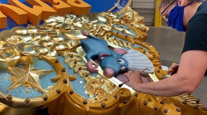Riddley notes, “This original sculpture is the result of a creative collaboration between Pixar and Imagineering artisans, and features Chef Remy surrounded by one of his favorite things — food! This photo captures the critical moment in the marquee’s creation as gold leaf is applied by hand, bringing shimmer and detail to one of our last finishing touches to the exterior of the attraction.”