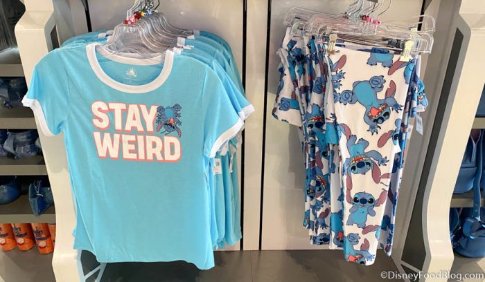 Finally, we stopped by Tomorrowland Light & Power Co. where we spotted this wacky Stitch merchandise. There’s a Stitch “Stay Weird” T-shirt for $36.99 and some matching Stitch Leggings for $39.99.