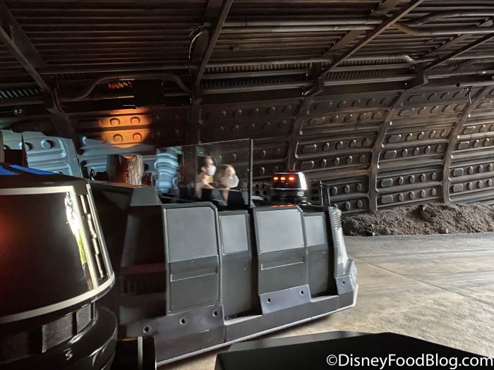 When we rode Rise of the Resistance right after the plexiglass was installed, we noticed that the Cast Members were still seating just one party per vehicle. But, during our most recent trip, Cast Members were in fact seating two separate parties in the same vehicle, separated from one another by the plexiglass barrier. You can see the party sitting in front of us in the picture below, but we were separated by the plexiglass barrier.
