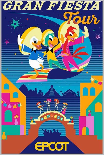 Next, we have a feeling this poster will have us singing ALL day long. It’s the Three Caballeros in a design celebrating Gran Fiesta Tour! This poster is even more colorful than the last! Our three favorite singing birds are front and center and below them we see scenes from the attraction including the bridge you sail under during the ride with those skeleton musicians on top.