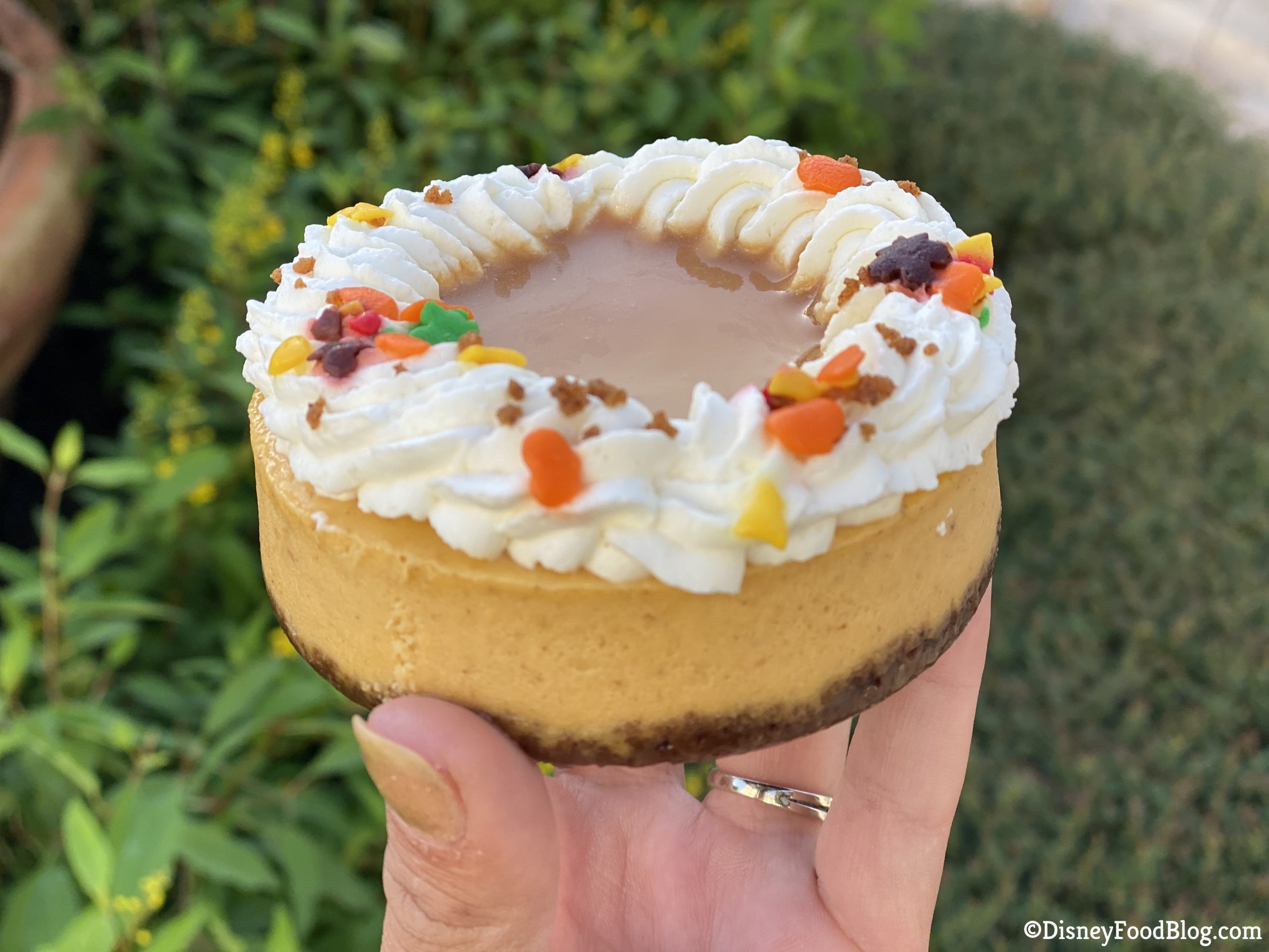 This treat is made of pumpkin cheesecake with a gingersnap crust and topped with whipped cream and fall sprinkles. It’s pretty cute!