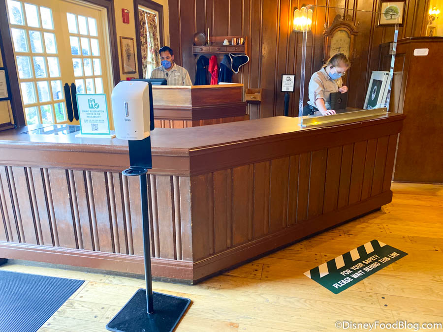 The check-in counter has been outfitted with a plexiglass barrier between guests and Cast Members. You can also scan a QR code to view a virtual menu, and snag some hand sanitizer on the way in.