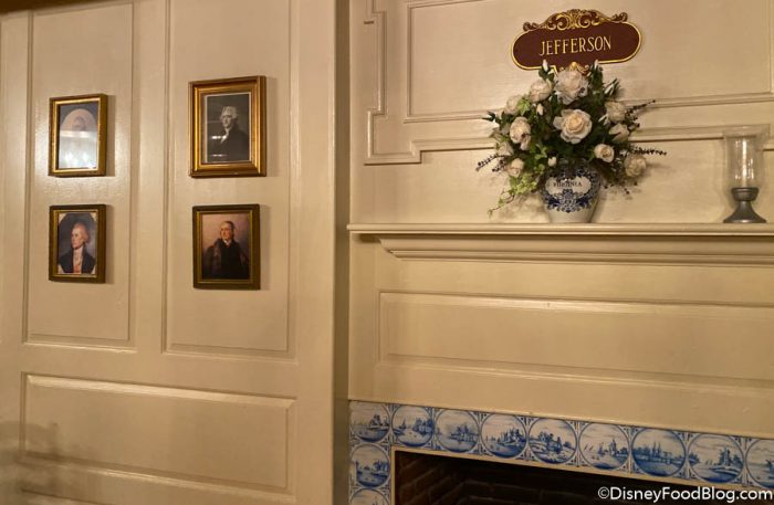 The dining rooms of Liberty Tree Tavern are each decorated after a late 18th century home and inspired by a famous historical figure. When in doubt, take a look at the walls to find out who! For example, you’ve got the Jefferson room. “Mr. Jefferson, welcome hooooome!” Sorry guys, you might be in for a couple Hamilton lyrics. We can’t help ourselves. It’s still a bop.