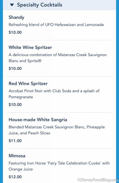 Here’s a look at the alcoholic drink options at Liberty Tree Tavern! Non-alcoholic beverages, including the Patriot’s Slush, are also available.