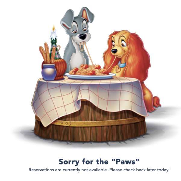 We’re no longer getting the Lady and the Tramp error on the site, but we were still unable to make reservations at time of writing. Despite showing availability, we were met with another message when we tried to book on the Disney site.