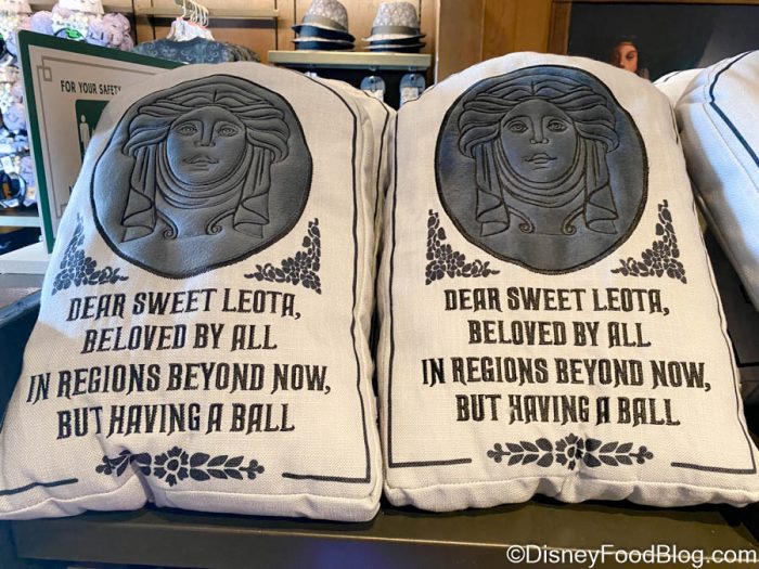 The pillow is modeled to look like Leota’s tombstone outside of the attraction.
