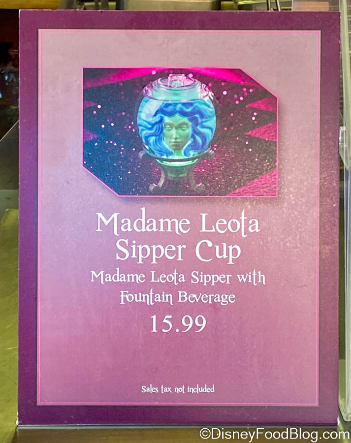 Over at Sleepy Hollow, we noticed this sign was still up. The Madame Leota sippers that everyone went crazy for are still in stock!