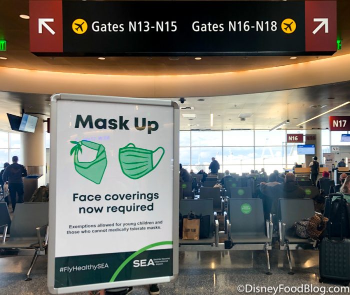 Airlines are taking the rule very seriously and reminding passengers to pull their masks completely over their mouths and noses while onboard. While most of us are growing accustomed to wearing masks when out and about for short period of time, our big tip here is to prepare for long hours wearing a mask. Try practicing with long walks while wearing a face-covering to help you adapt. This will also help you prepare for wearing a mask inside Disney World!