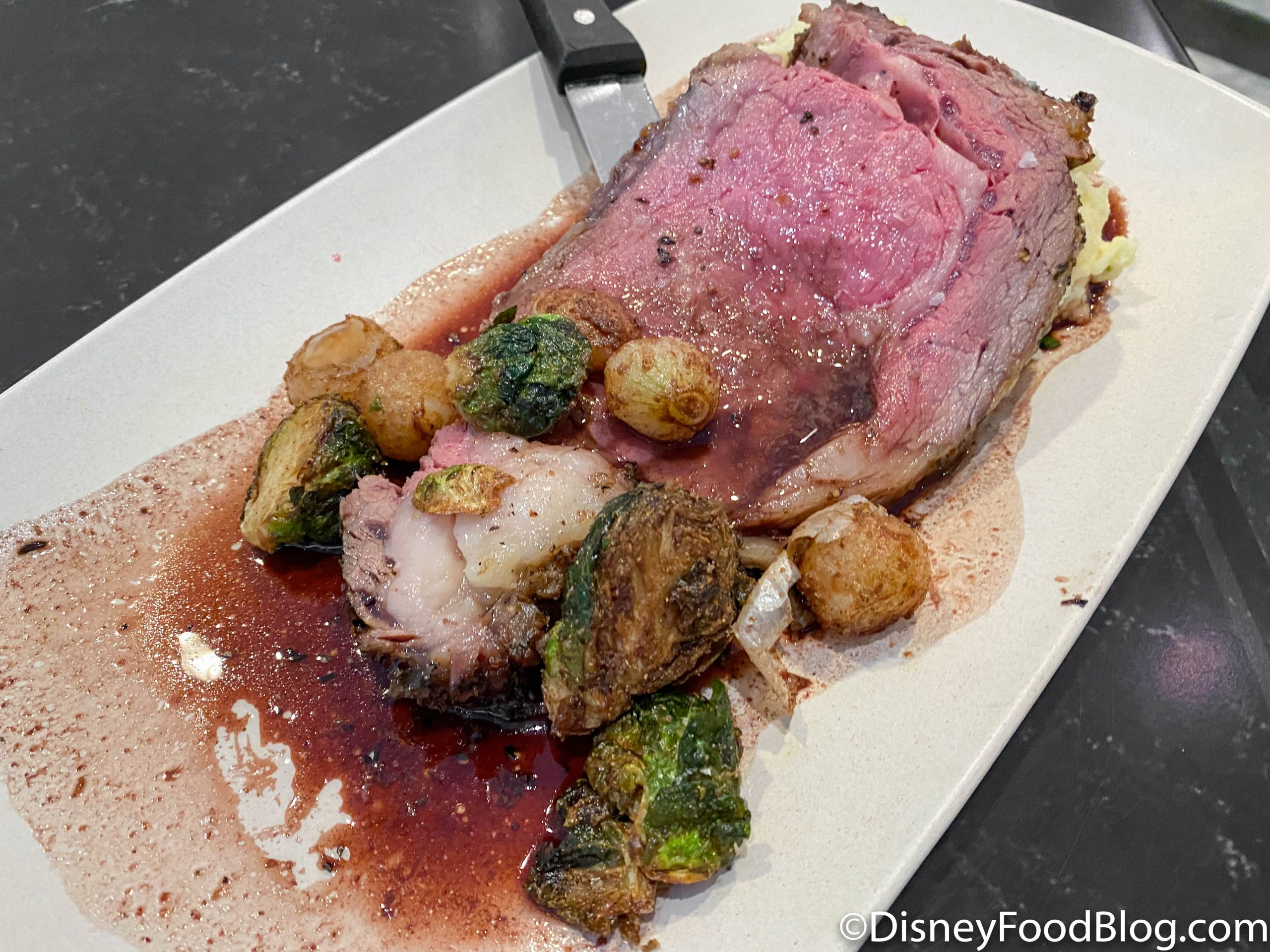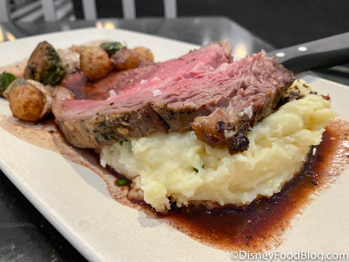 For our entree, we ordered the Garlic and Cracked Black Pepper Prime Rib of Beef, which comes with Sour Cream-Chive Whipped Potatoes, Fried Brussels Sprouts, and Pearl Onions with Red Wine Jus.