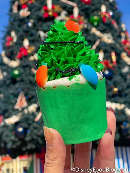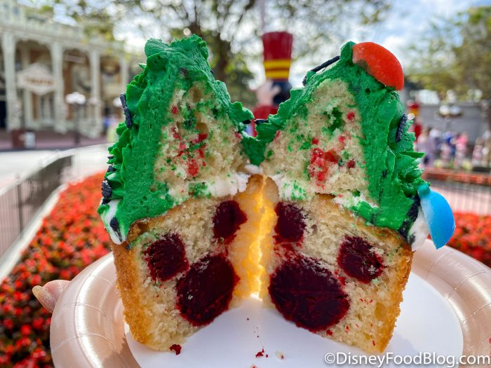 A few days ago, we shared a whole list of festive treats that would be coming soon to the parks, and now we finally got to try a NEW cupcake with a surprise inside that JUST arrived in Magic Kingdom!