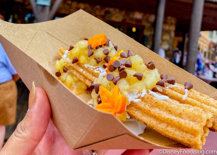 A gingerbread churro topped with apple pie filling, marshmallow icing, and chocolate chips? Yum!