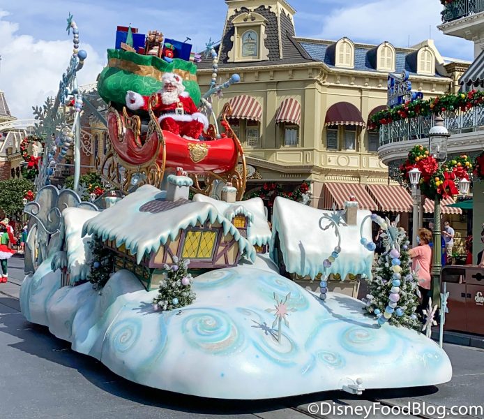 There are lots and we mean LOTS of Disney and Christmas characters strolling through Magic Kingdom as part of the Holiday Character Cavalcades. We spotted Santa perched high in his sleigh…