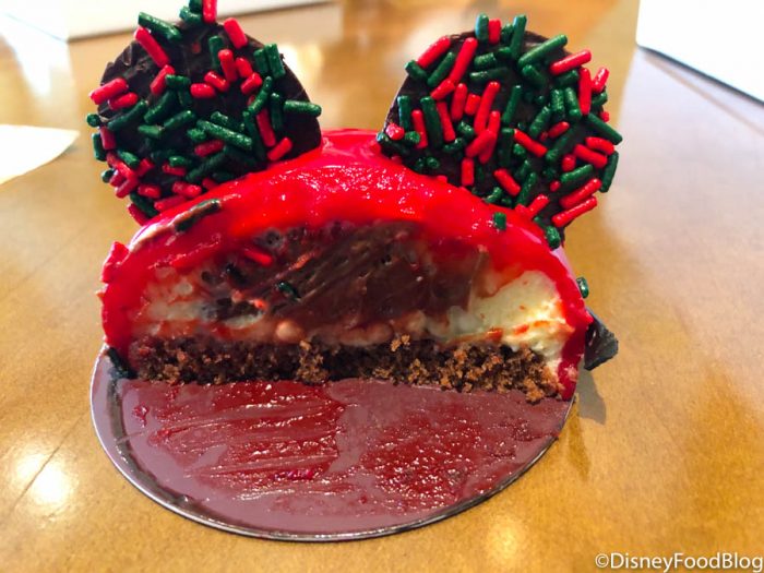 But, today we found a holiday dome cake we just HAD to try — it’s the NEW holiday version of the mini Mickey dome cake!