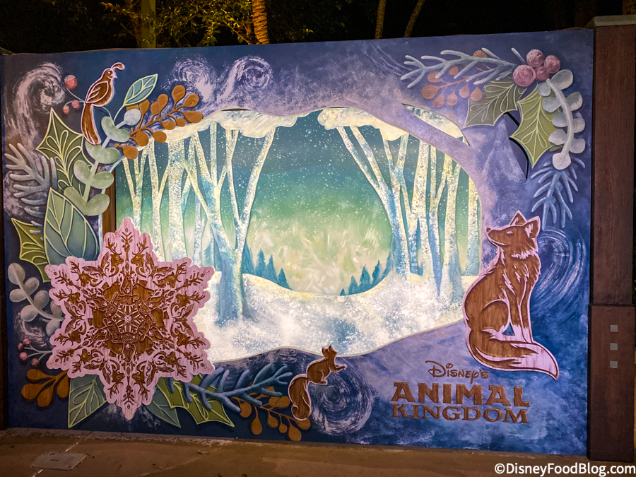 Okay, let’s get into the holiday decor! There was so much festive fun at Disney’s Animal Kingdom! When we visited the park after dark, we noticed that both the Merry Menagerie photo op at the entrance…