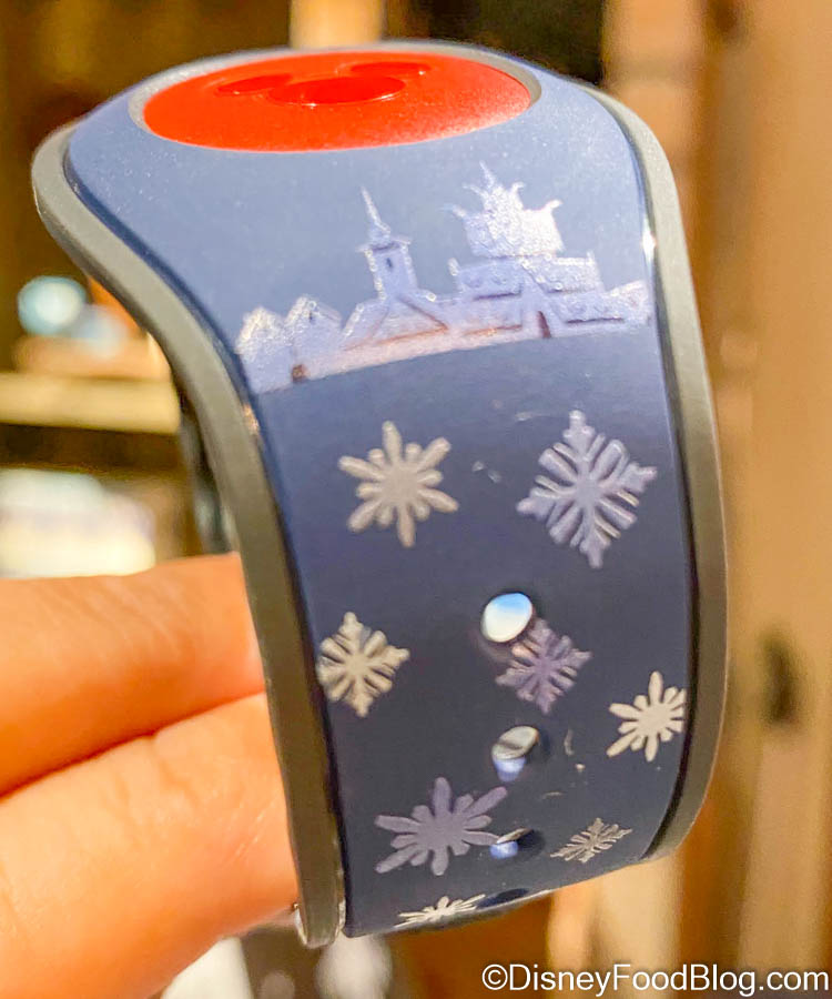 The other side of the band shows off the outline of the World Showcase with a simple snowflake pattern. The MagicBand itself is a muted blue shade with a red center puck.