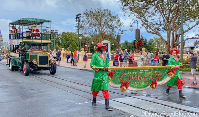 We’ve seen rainy day cavalcades before, but somehow they’re even cuter during the holiday season! First, we caught Santa and friends coming down Main Street, U.S.A. The parade leaders were all dressed up in their rainy day best, but there was a twist — their raincoats and hats are red and green!