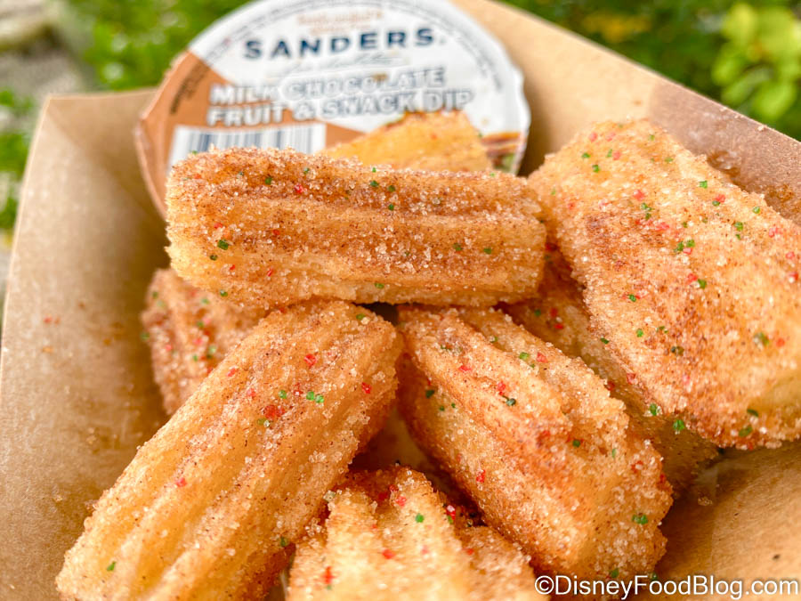 Once our food was ready, we stepped inside to pick it up. These guys looked golden and delicious! They’re topped with red and green sugar to give that Christmas touch much like the mini Halloween churros we had just a few weeks ago.