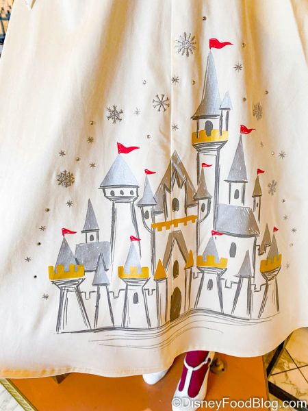 This dress features a print of Cinderella Castle on it in silver and gold (with bright red flags).