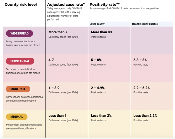 Metrics needed for California counties to advance to reopening tiers. Source: covid19.ca.gov